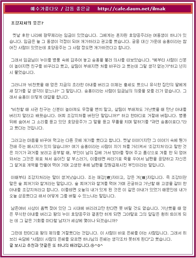 작성자현엄마 작성시간 12.01.14 아멘!! 조강치처를 버리지마시오 ㅎㅎㅎㅎㅎㅎㅎ