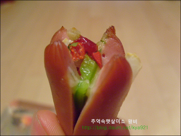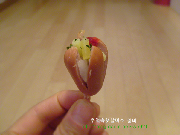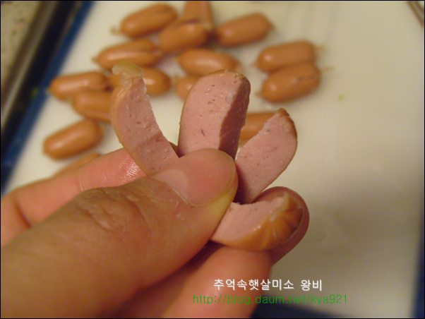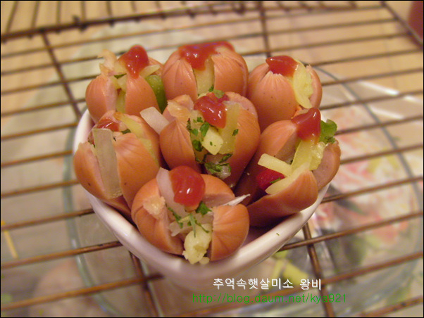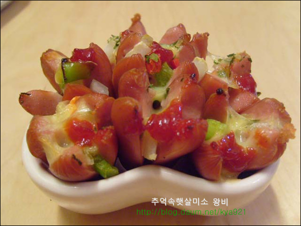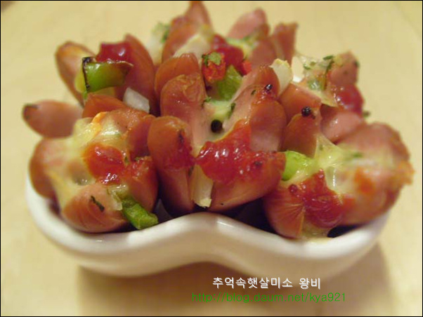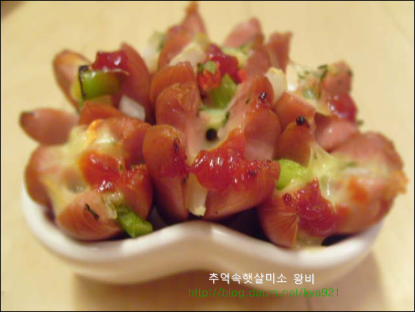 비엔나 소세지는 간편하게 술안주로 아이들 도시락 반찬으로도 잘 이용하는 재료 입니다 비엔나 소세지를 맨날 칼집넣고 둘둘 볶아만 드시나요? 별로 어렵지 않고 간단하면서 맛있게 해 먹는 방법 알려드릴게요 비엔나는 핫도그처럼 만들어도 귀엽고 재미있는 맛있지만 피자처럼 만들어 먹어도 넘 맛있습니다.. 비엔나로 핫도그를 만들어 기름에 튀길때에는 비엔나가 열받아서 펑 튀니가 칼집을 꼭 내셔야 해요..(주의) 비엔나 소세지는 칼집을 열십자로 길게 냄니다.. 내용물이 많이 들어가게 길게 칼집을 냅니다.. 양파,청피망,홍피망을 잘게 다지듯이 썰어서 비엔나 소세지에 넣고 슬라이드 치즈 올리고,케찹 한방울 떨어드리고,파슬리 살짝 뿌려 줍니다.. 완전 소꼽놀이 하는것같죠..ㅎ 그릇에 담아서 열 오른 오븐에 200도 5분만 구워 줍니다.. 치즈가 사르르 녹으면서 맛있는 비엔나 소세지가 됩니다.. 피자맛이 나는 비엔나 소세지 입니다.. 뜨거울때 바로 하나씩 먹어주면 피자맛이 난다고 아이들이 넘 좋아해요.. 맛있다고 자주 해서 드시지는 말고, 간단한 방법이니 한번쯤만 해보세요..^,~ 영내에게서 전화가 왔습니다..산에 운동 다녀오라고요... 요즘 운동이 절실히 필요함을 느낌니다.. 오늘도 즐거운 하루 보내세요...^....^;;