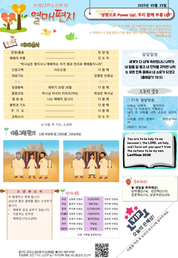 2025.5.25 브니엘교회 소년부 예배 안내 작성자Hyungsang|작성시간25.05.24|조회수8 목록 댓글 0 글자크기 작게가 글자크기 크게가 내일은 예배하는 주일 입니다모두 교회에서 만나요^!^ 다음검색 현재 게시글 추가 기능 열기 북마크 공유하기 신고 센터로 신고 댓글 댓글 0 댓글쓰기 답글쓰기 댓글 리스트