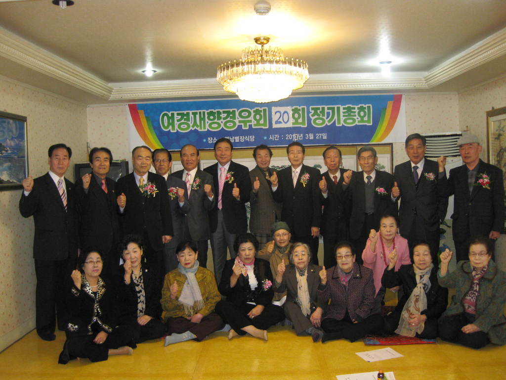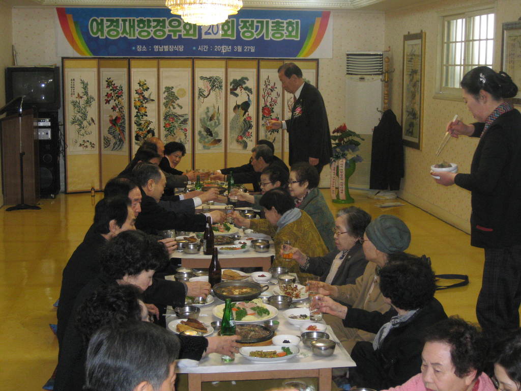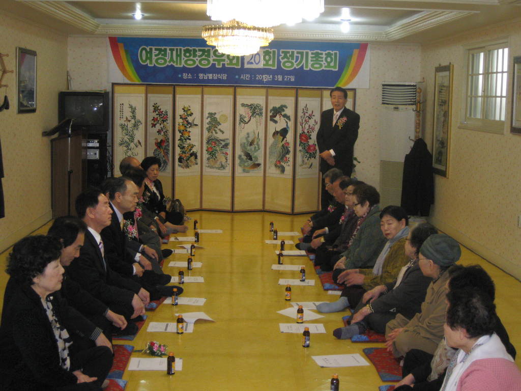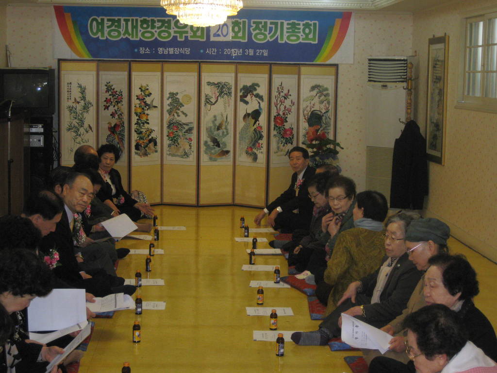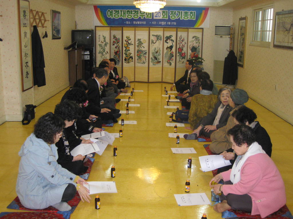 대구광역시 재향여경우회 제 20차 정기 총회를 대구시 중구 하서동 소재 "영남 별장" 특별실에서 개최한바 시경우회 회장을 대신하여 사무처장 김영권님, 시경우회 지도위원 이동립님, 김영헌님과 지역회장 동부 주인동,성서 김광조, 북부 한영길, 수성 김무웅, 달서 신동선님, 전 참전회장 변인섭, 사무국장 안희주, 경우산악회 총무국장 백한식님 등과 팔순 고령이신 여경우회 회원님이 참석한 가운데 지난 8 년간 대구시 여경우회를 이끌어 오신 황정남 회장님의 인사 말씀과 정기 총회는 유인물로 대신하며 질의 응답 후 한정식으로 만찬을 하며, 앞으로 여경우회의 발전 방향에 대한 토의가 있었읍니다.