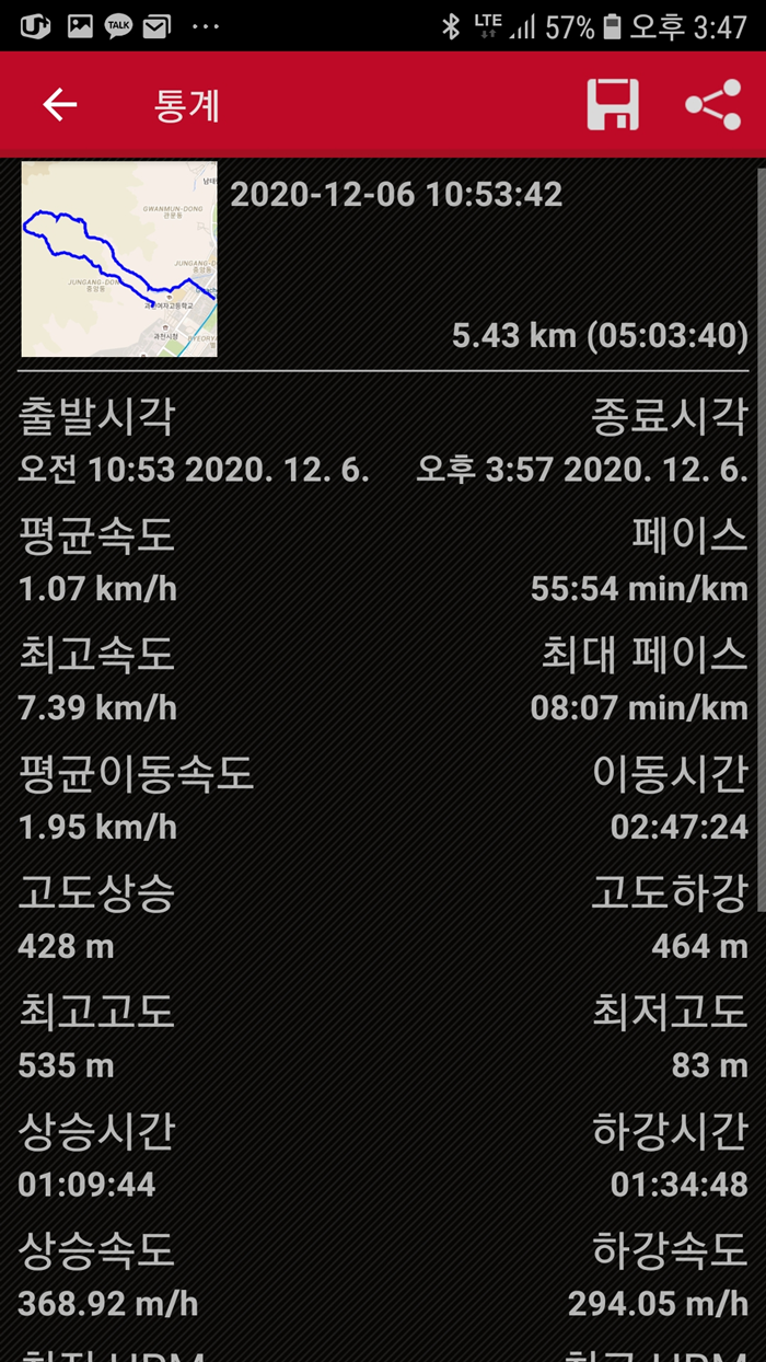 총 거 리 : 약 7.43km 산행시간 : 5시간 3분(2시간 20분 점심식사 시간 포함)