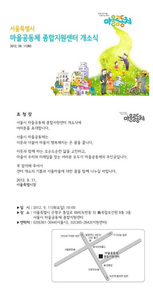 서울시 마을공동체 종합지원센터 개소식에 초대합니다 작성자희망마을|작성시간12.09.10|조회수14 목록 댓글 0 글자크기 작게가 글자크기 크게가 다음검색 현재 게시글 추가 기능 열기 북마크 공유하기 신고 센터로 신고 댓글 댓글 0 댓글쓰기 답글쓰기 댓글 리스트