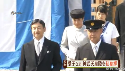 나루히토 왕세자 일가가 21일 일본의 초대 덴노 진무덴노의 릉 (나라현 가시하라시)에 참배했다.