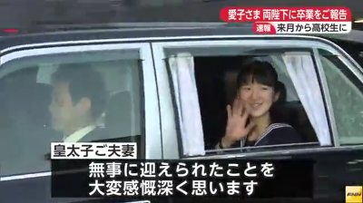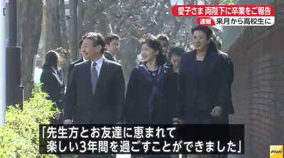 22일 오전 왕세자 부부와 함께 등교한 아이코는 "선생님과 친구들의 축복 덕에 즐거운 3년을 보낼 수 있었습니다."라고 말했다.
