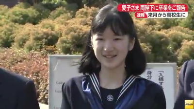 왕세자 부부는 궁내청을 통해 "오늘 아이코가 가쿠슈인 여자 중학교 졸업식을 무사히 맞이할 수 있어서 매우 감개무량하게 생각한다."고 소감을 전했다. 아이코는 이번 4월에 가쿠슈인 여자고등학교에 진학할 예정이다.