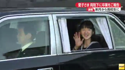 가쿠슈인 여자중학교를 졸업한 왕세자 부부의 장녀 아이코가 22일 오후 아키히토, 미치코에게 졸업을 보고하기 위해 왕궁으로 향했다.