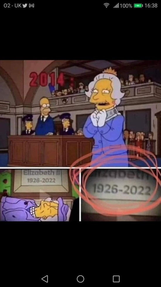 인터넷상에서 심슨 만화가 엘리자베스 여왕이 2022년 사망할 것을 미리 예보하였다는 사진이 퍼지고 있는데, 이는 교통사고를 일으킨 심슨이 여왕과 법정에 선 내용을 다룬 에피소드에서는 나오지 않는 장면인지라, 이 사진은 의도적으로 편집된 것으로 보인다. 이로 인해 현재 여왕의 죽음을 일루미나티와 연관지으려는 사람들을 황당한 음모론가로 몰아가는 글들이 올라오고 있는데, 개인적으로는 일루미나티들이 의도적으로 이런 역정보를 흘려 일루미나티를 비판하는 사람들의 신뢰를 떨어뜨리는 것으로 보인다. 자세한 것은 이를 분석한 아래 동영상을 참조하기 바란다.