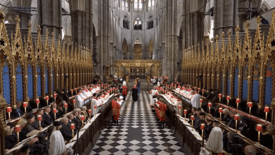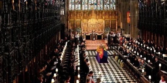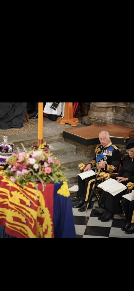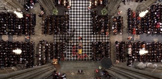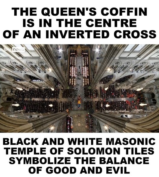프리메이슨 랏지와 마찬가지로 일루미나티(프리메이슨)의 의식이 치러지는 체크무늬 바닥에서 엘리자베스 여왕의 장례식이 치러지고 있다.