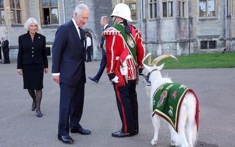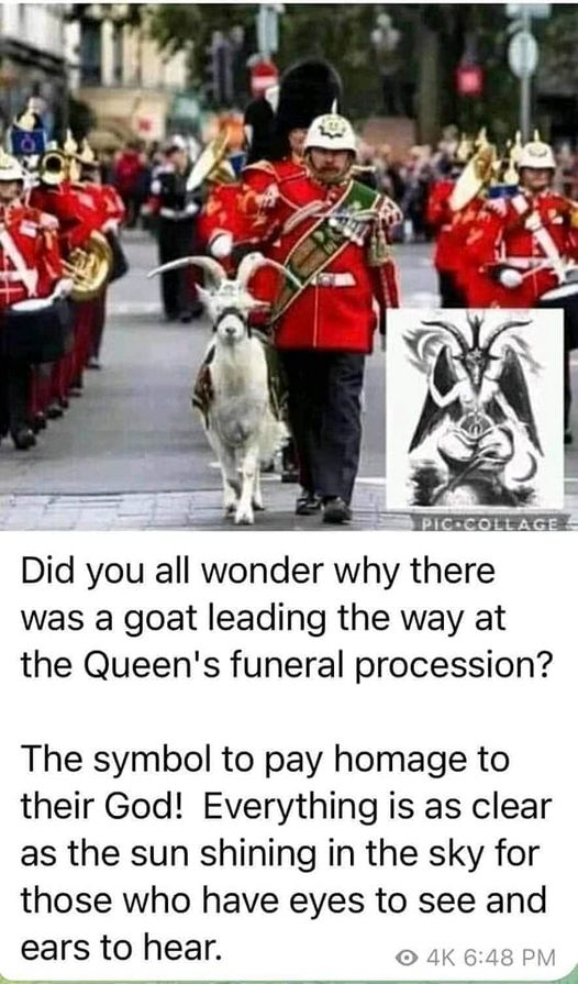 아래는 지난 17일 거행된 엘리자베스 여왕의 장례식과 장례행렬의 모습이다. 일루미나티가 숭배하는 바포멧 모양을 한 염소가 여왕의 장례행렬을 이끄는 모습이 특이한데, 다른 것은 몰라도 사탄을 숭배하는 일루미나티의 대모인 엘리자베스가 저가 숭배하는 사단(바포멧)의 인도를 따라 지옥에 떨어진 것만큼은 분명한 듯싶다.