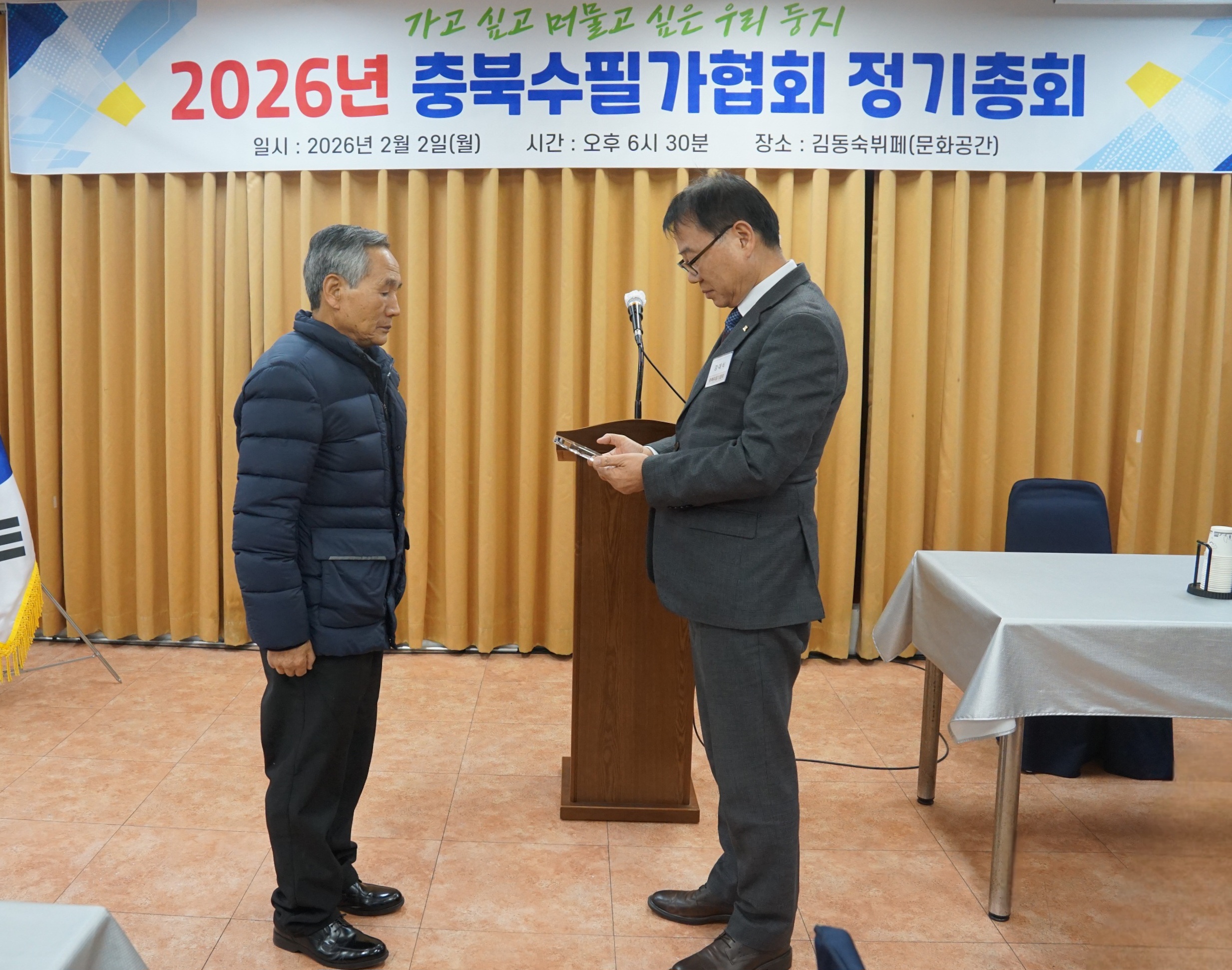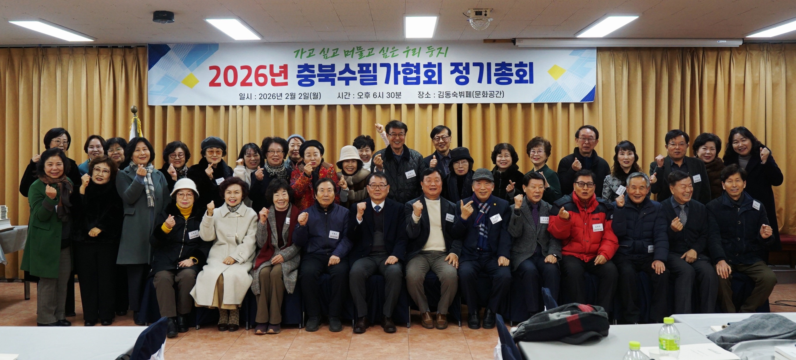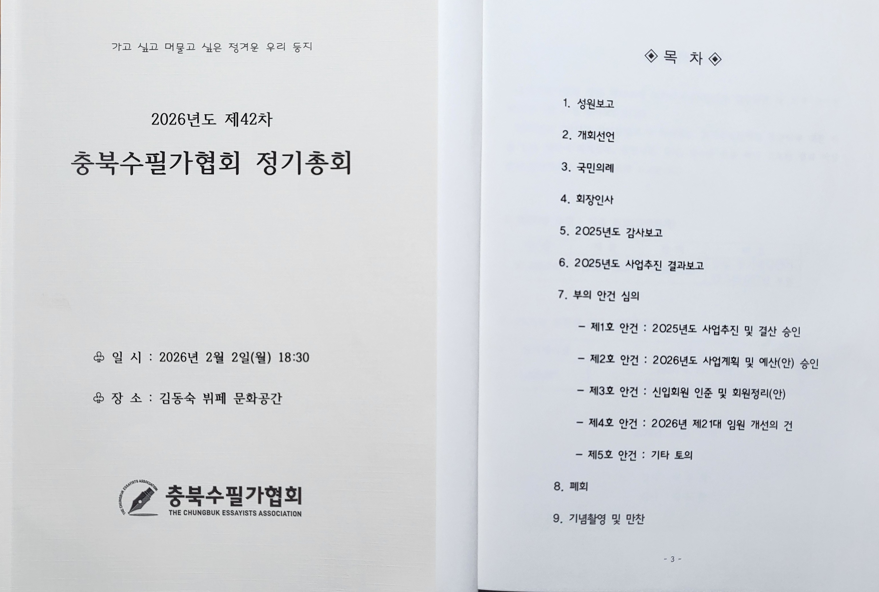 26년 2월 정기총회 작성자임현택|작성시간26.02.06|조회수13 목록 댓글 0 글자크기 작게가 글자크기 크게가 26년 정기총회날짜-26년 2월 2일장소-김동숙뷔페 문화공간 정기총회 및 김진웅작가님충북수필문학상 시상식 다음검색 현재 게시글 추가 기능 열기 북마크 공유하기 신고 센터로 신고 댓글 댓글 0 댓글쓰기 댓글 리스트