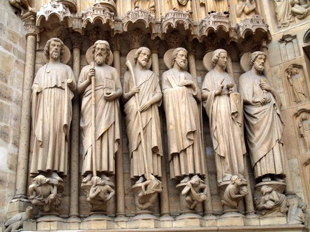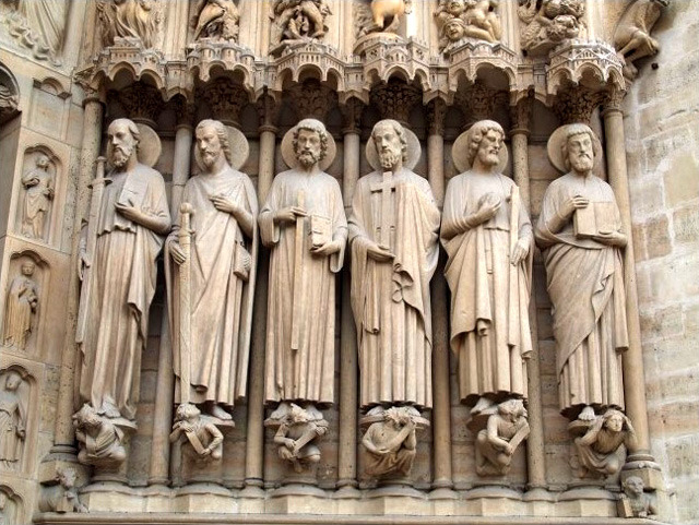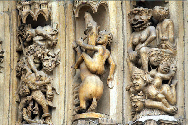 문의 좌우측 벽에는 12명의 사도가 12가지 善과 惡을 상징하는 부조물 위에 서 있다.