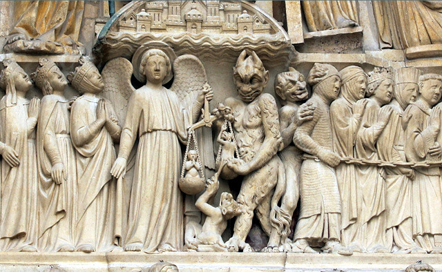 가운데 부분은 천사장 성 미카엘에 의해 죄를 저울질하여 천당과 지옥으로 나뉘어지는 모습,