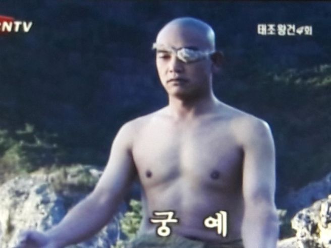 '태조왕건' 대하드라마에서도 궁예는 애꾸눈으로 나온다. 드라마에서 황금빛 애꾸눈가리개 궁예상징 처럼 보이게 해 주었다.
