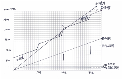 <표>의 회사는 창업 후 지속적인 성장을 하여 3년 차에 들면서 월 매출 2천만 원을 달성하였지만 소모성 고정비, 고정비, 준 고정비, 변동비 합하여 월 1,867만 원 정도 사용하게 됨으로 겨우 월 2- 3백만 원의 수익을 내는 것이 됩니다. 위 그림처럼 매출액이 꾸준히 신장한다고 가정했을 때 만 3년이 지나야 그동안 입은 손해와 이익이 상쇄되어 본전이 된다는 것입니다.
