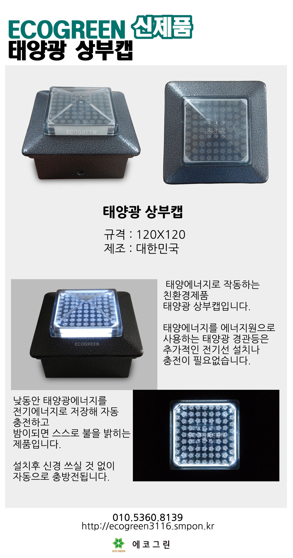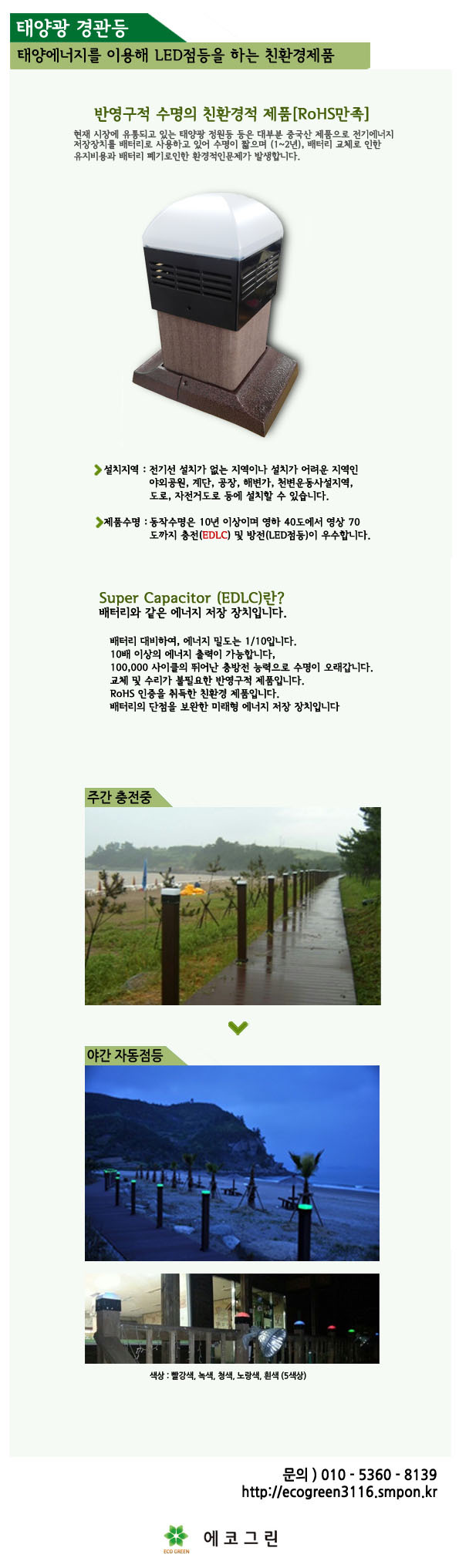 태양에너지를 에너지원으로 사용하는 태양광 경관등은 추가적인 전기선 설치나 충전이 필요없습니다.