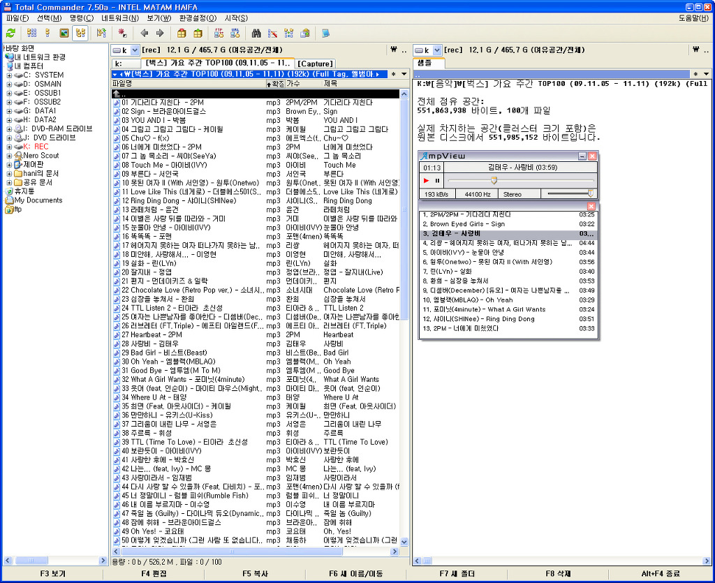 - 음악파일용 모드 (다음처럼 음악파일에 포함된 정보를 불러와 가수/제목/비트/시간 등을 보여줄 수도 있으며(플러그인기능)