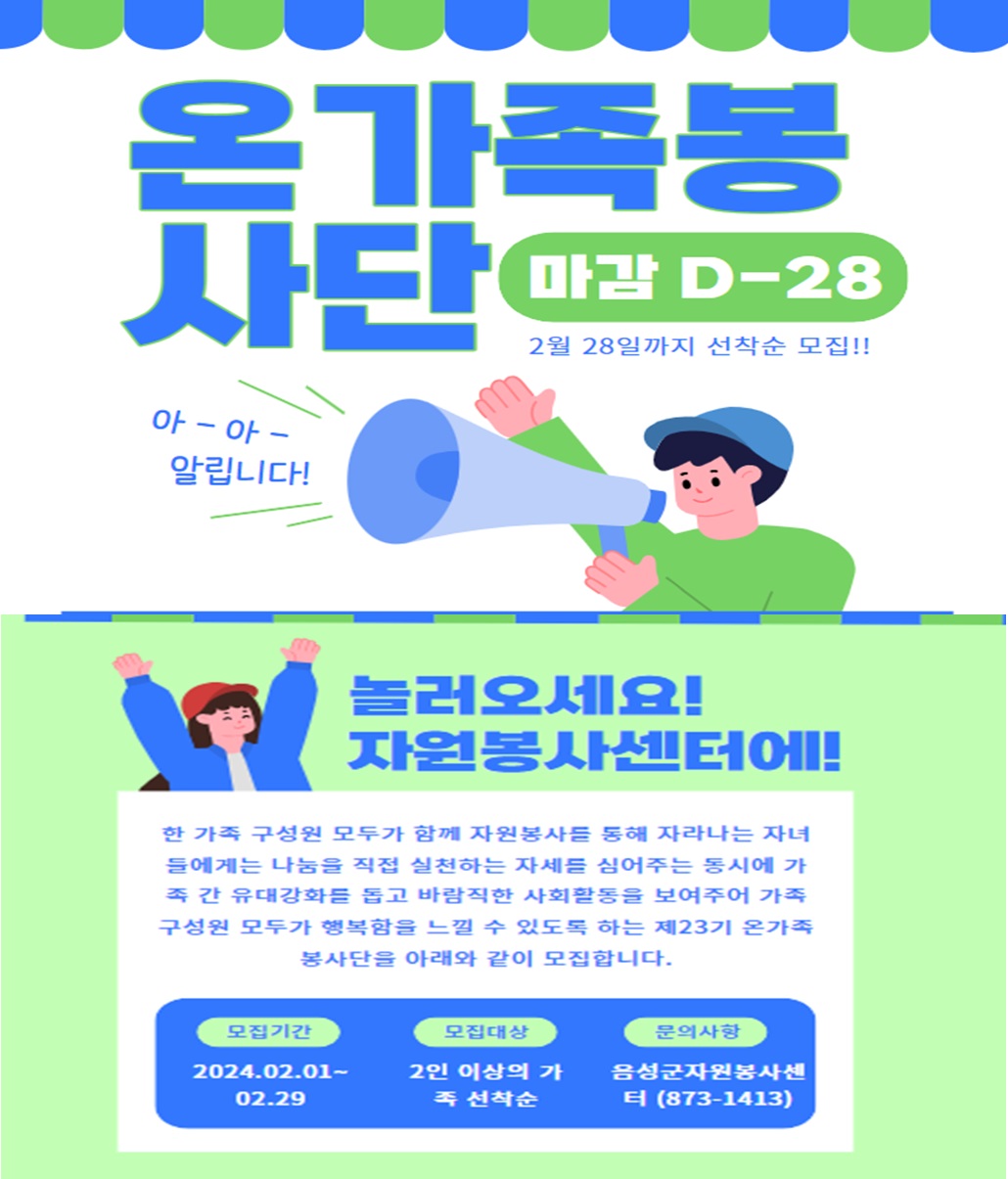 행복하고 건강한 가족만들기 "온가족봉사단" 모집 작성자음성군자원봉사센터|작성시간24.02.16|조회수141 목록 댓글 0 글자크기 작게가 글자크기 크게가 다음검색 현재 게시글 추가 기능 열기 북마크 공유하기 신고 센터로 신고 댓글 댓글 0 댓글쓰기 답글쓰기 댓글 리스트