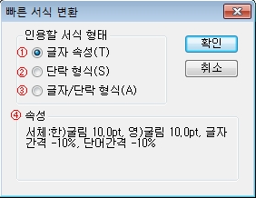 3. "빠른 서식 변환" 대화상자에서 인용할 서식 형태(글자 속성, 단락 형식, 글자/단락형식)를 선택하고 확인을 누릅니다.