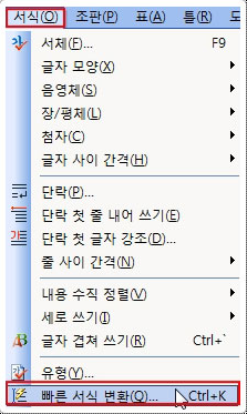 2. 편집 도구 바의 빠른 서식 변환(Ctrl + K) 아이콘 또는 [서식] - [빠른 서식 변환] 메뉴를 선택합니다.