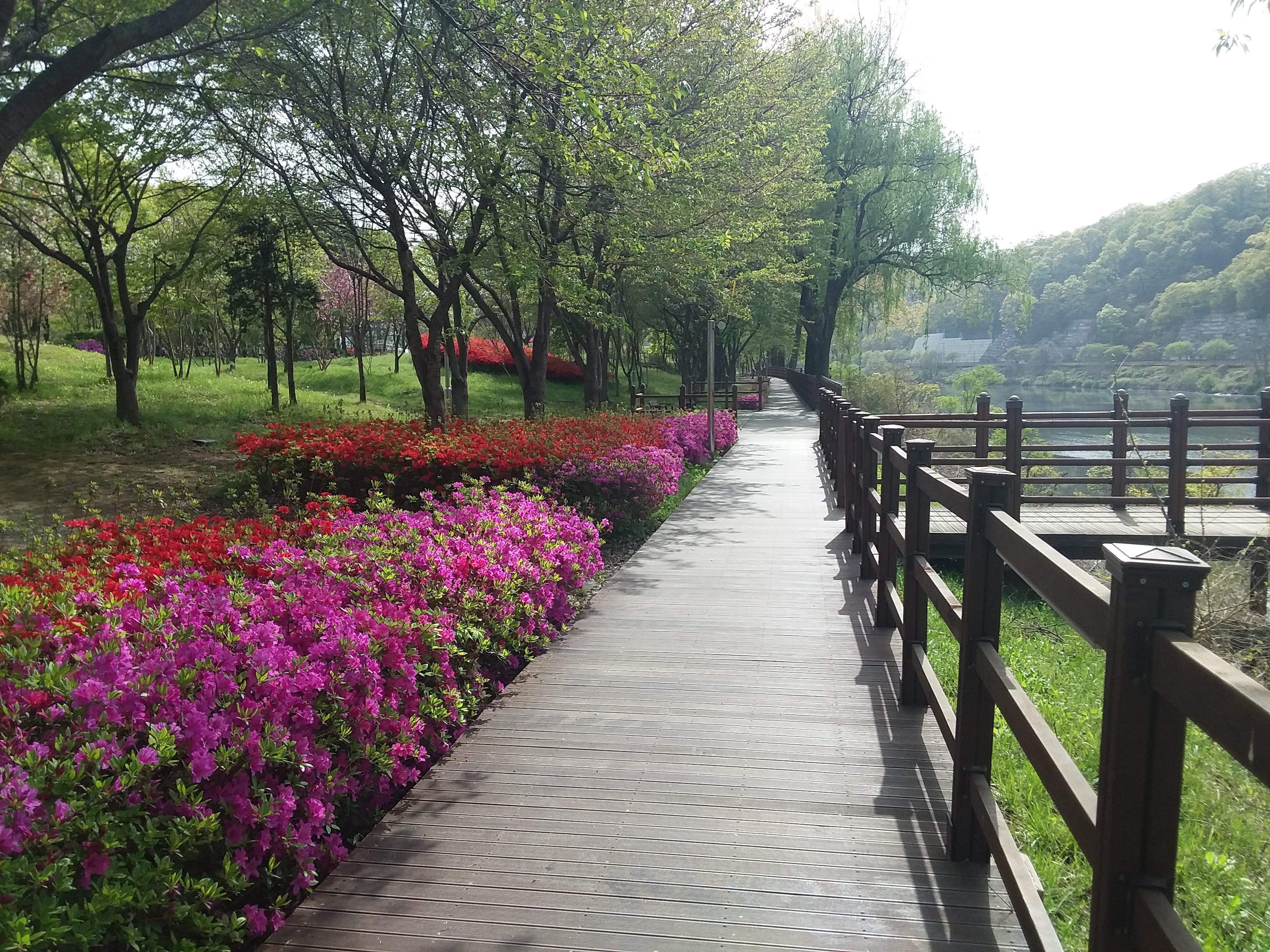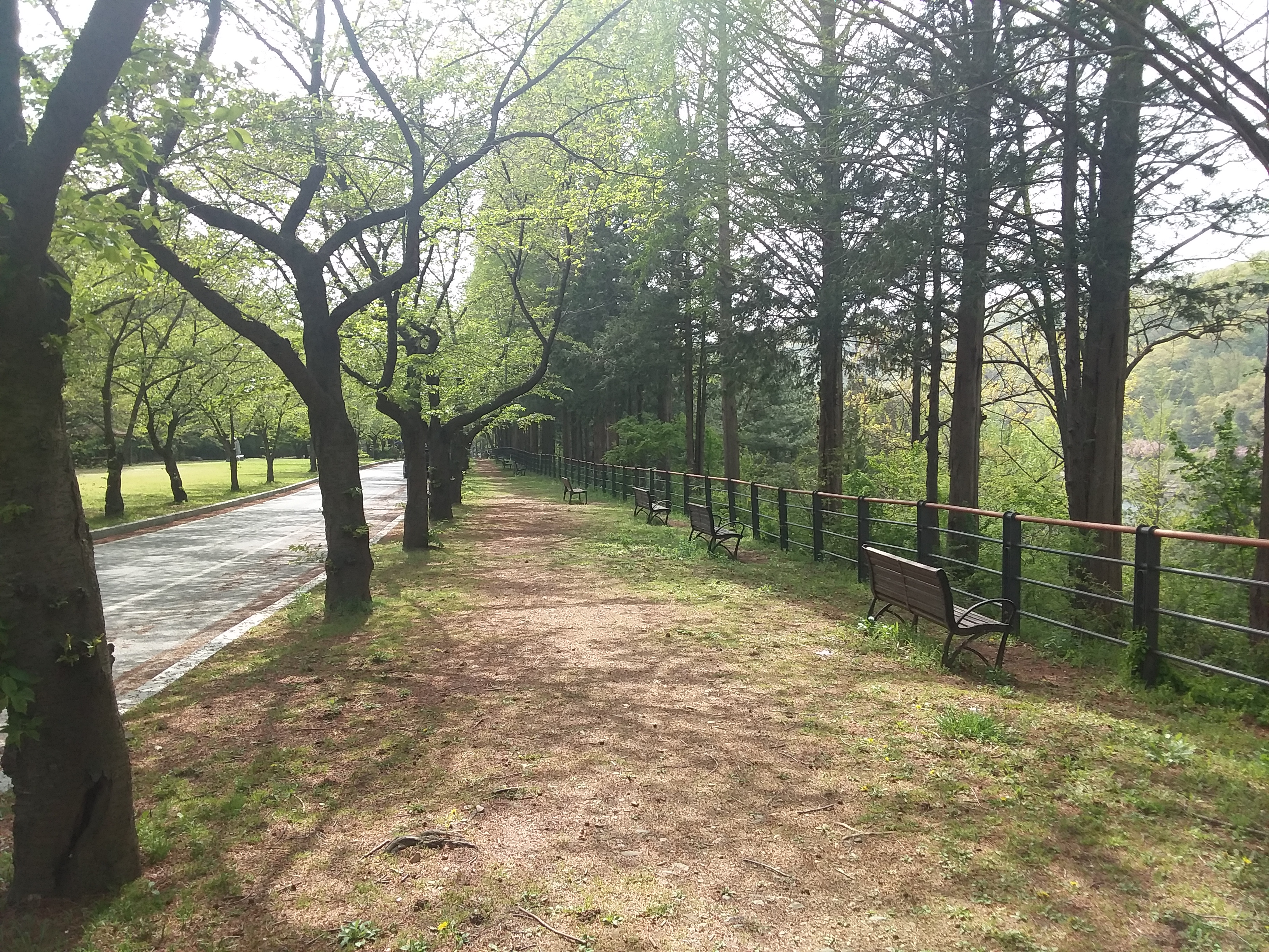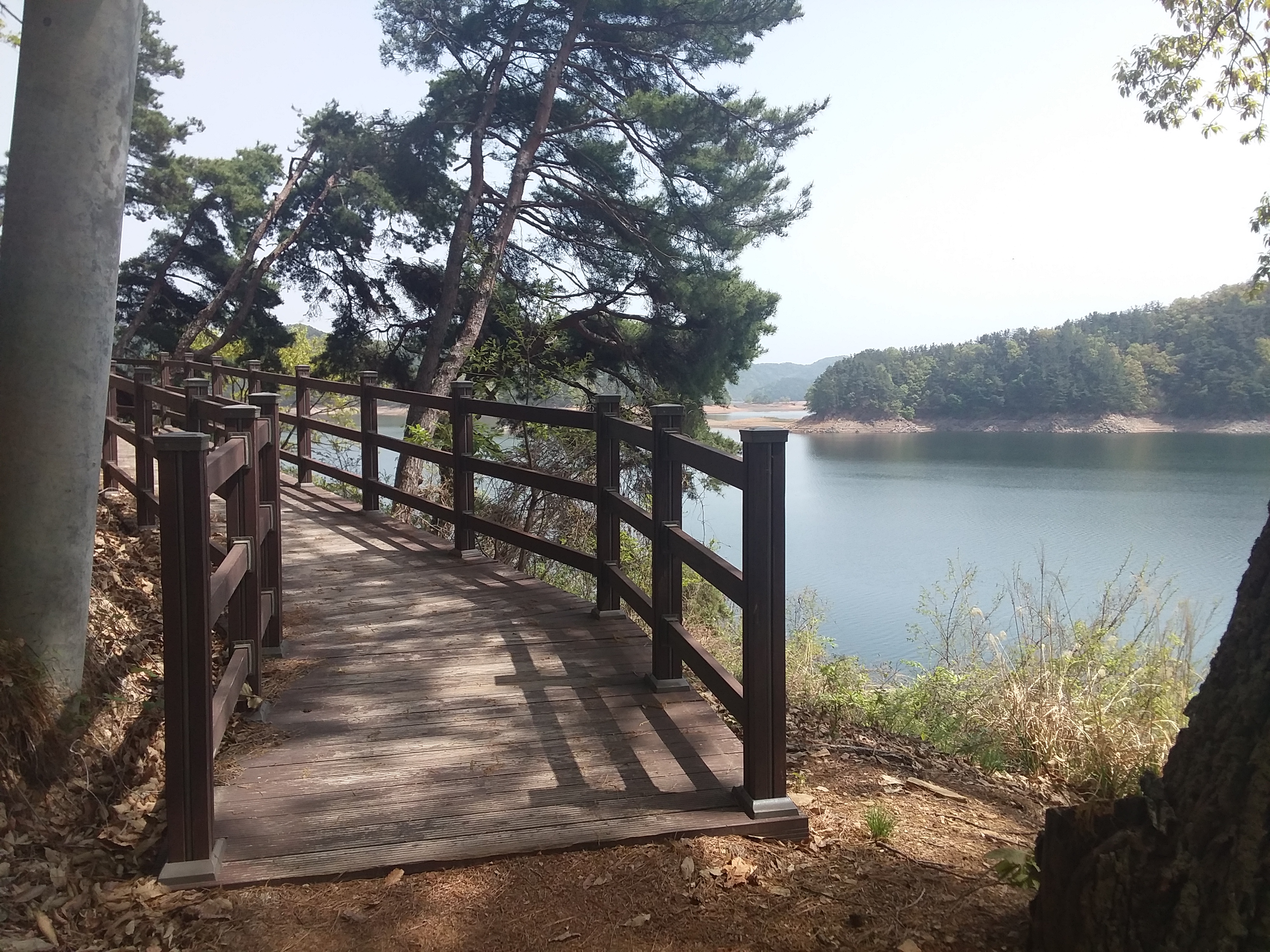 2. 약 2시간이 넘는 산행을 마치고, 다음 코스로 이동했다. 이 코스는 대청댐 주변에 만들어진 공원과 꽃길을 따라 걷는다. 대청호에서 이어지는 하천을 따라 싱싱한 나무들이 줄지어 서 있었다. 그동안 제법 많은 댐과 호수를 보았다. 얼핏 댐과 호수의 풍경에서 특별한 차이가 없는 듯하지만, 자세하게 바라보면 각각의 개성이 엿보인다. 춘천 의암댐과 의암호의 힘찬 분위기와 비교하면 이곳은 좀 더 부드럽다. 주변의 산과 나무가 주는 여유로운 분위기때문인 것같다.