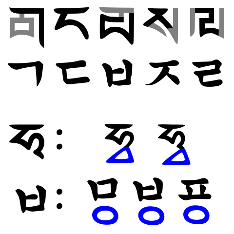 한글의 자음 ㄱㄷㅂㅈㄹ는 각각 발음이 비슷한 ꡂ [k], ꡊ [t], ꡎ [p], ꡛ [s], ꡙ [l]을 단순화한 형태이며, ㄱ, ㄷ, ㅂ, ㅈ에 획의 변화를 가해 유기음 ㅋ, ㅌ, ㅍ, ㅊ을 만들었고, ㄷ, ㅂ, ㅈ에서 한 획씩 지워 비 파열음 ㄴ, ㅁ, ㅅ을 만드는 식으로 한글의 자음이 제작되었다는 가설이다.