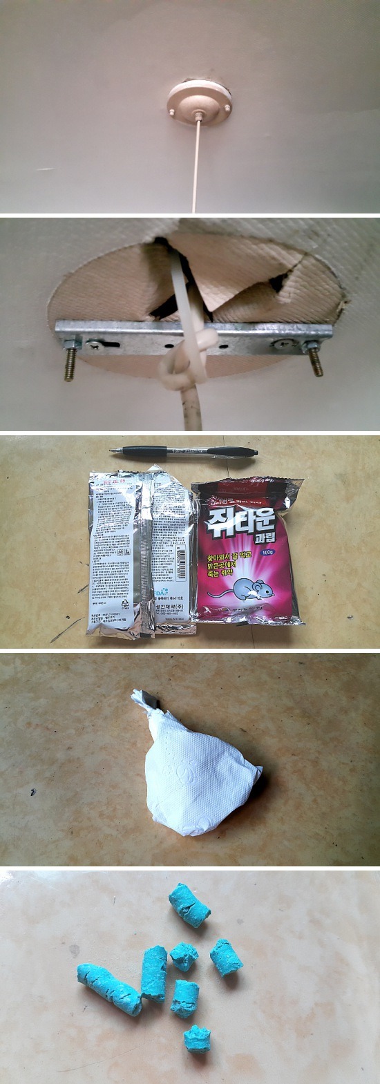 조금더 넓힌후 구입한 과립형 쥐약을 휴지에 싸서 천장 위로
