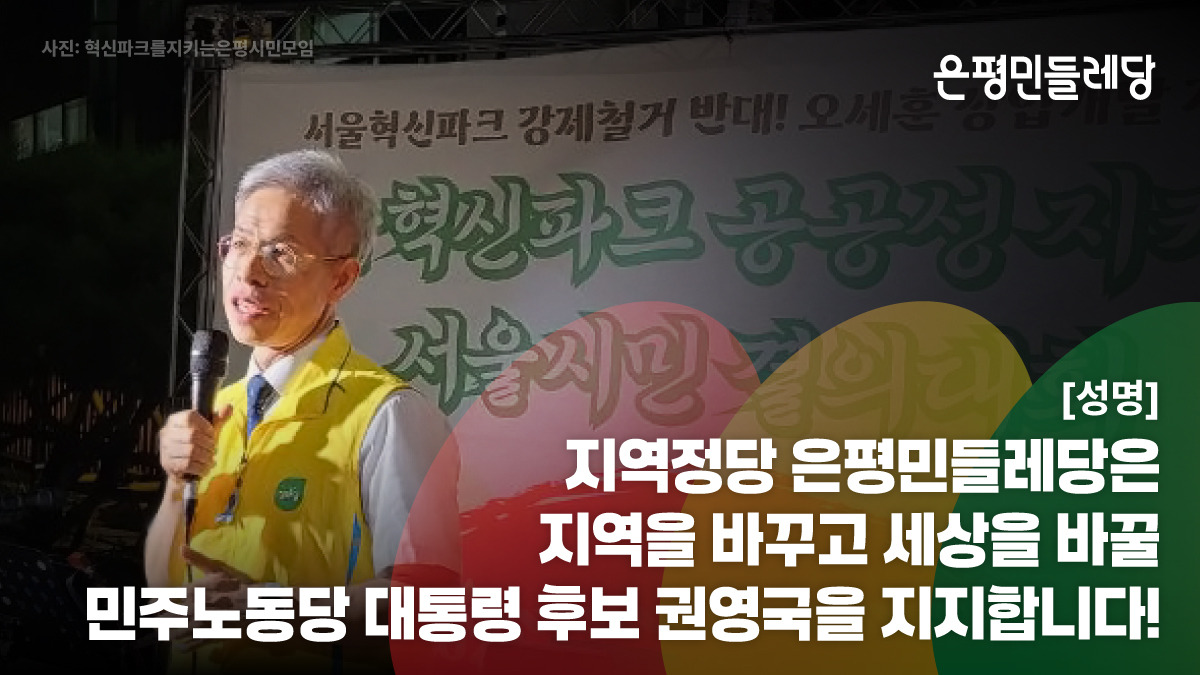 은평민들레당은 민주노동당 권영국 후보와 함께 지역을 바꾸고 세상을 바꾸겠습니다. 이 길에 앞장선 민주노동당 권영국 후보를 지지하고 동행해주시길 호소합니다.