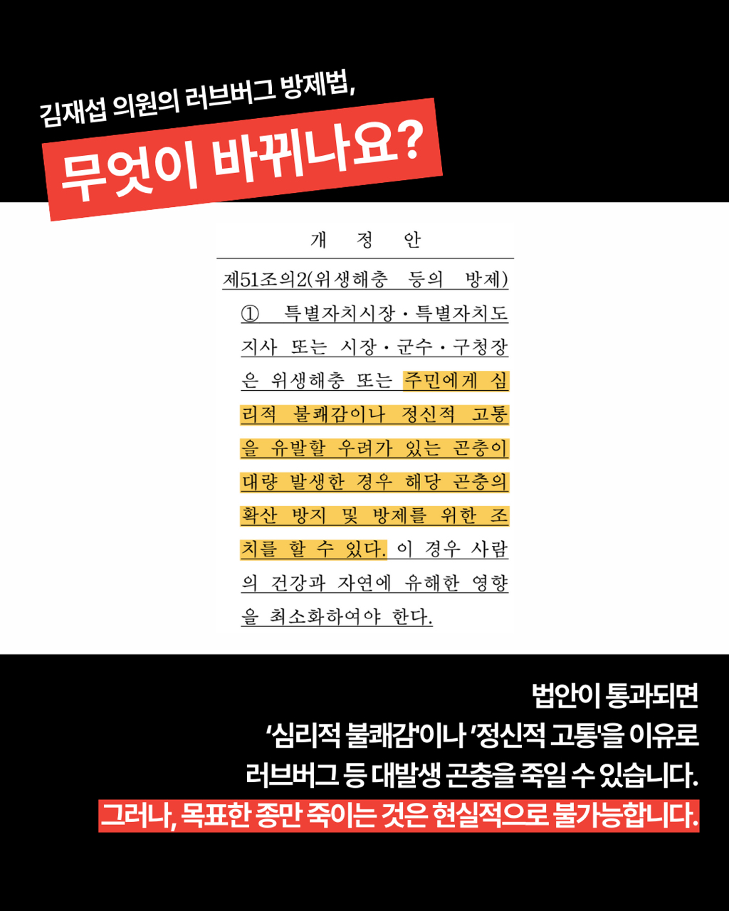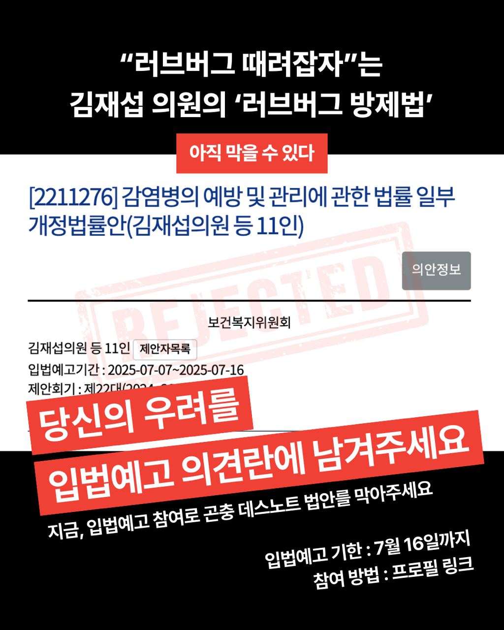 며칠 전 국민의힘 김재섭 의원이 대표발의한 일명 ”러브버그 방제법“인 <감염병의 예방 및 관리에 관한 법률 일부개정법률안>이 내일(7/16)까지 국회 입법사이트에서 시민 의견을 받고 있습니다.
