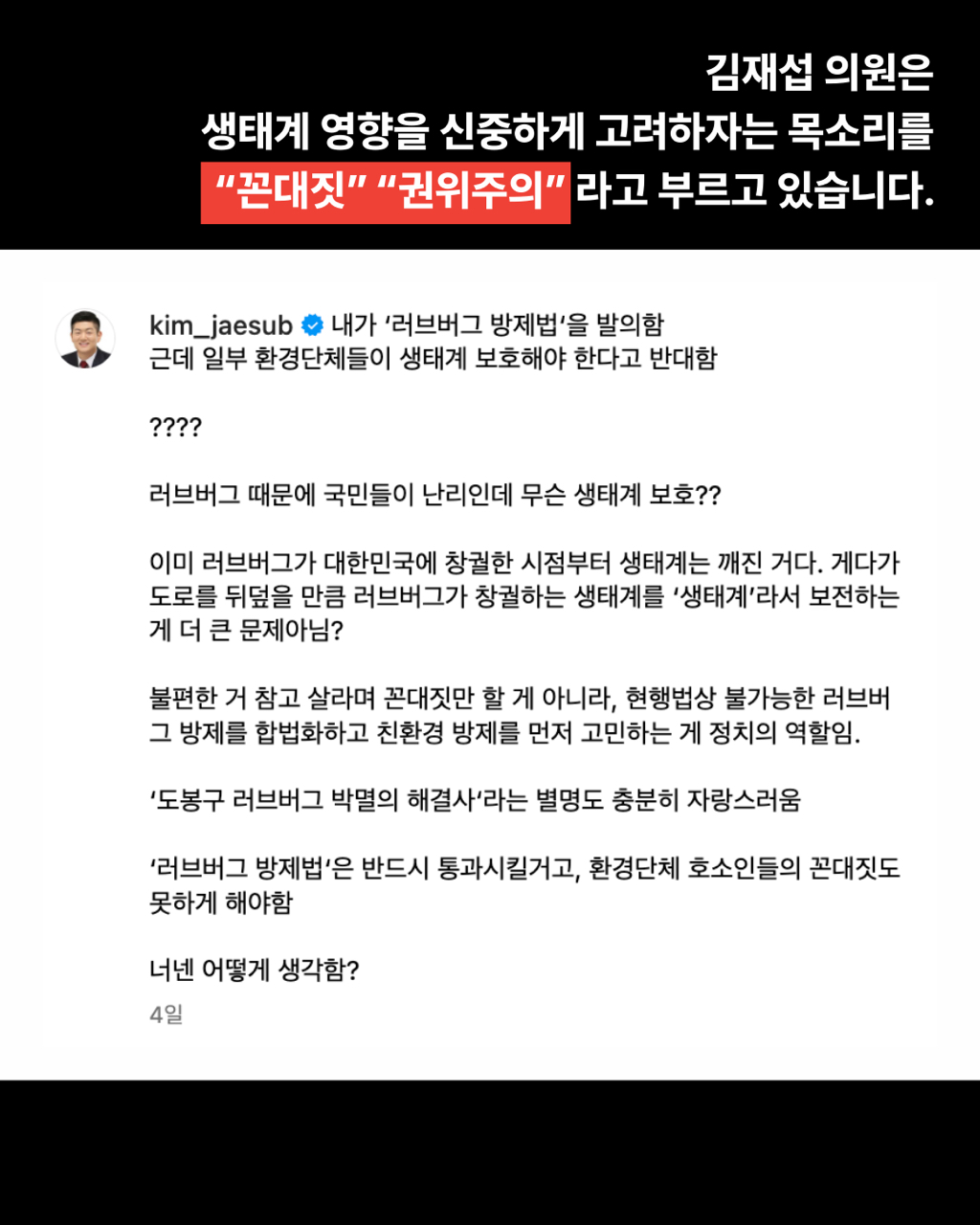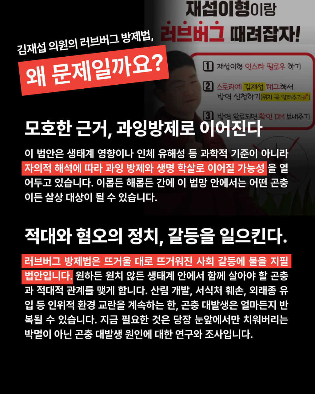 보건복지위원장인 더불어민주당 박주민 의원과 주진우의 ”징그러워 죽겠어요“, ”나는 보고 싶지도 않은데“ ”러브버그 잡아달라고 몇 년 전부터 말했잖아“ ”시민 불편을 준다“ 등의 극우세력과 하나 다를 게 없는 선동적인 유튜브 방송부터 시작해 김재섭 의원의 ”러브버그 때려잡자“ ”재섭이형“이 해결하겠다며 방제 법 발의하기까지, 생태계를 파괴한 인간으로서의 일말의 반성과 공존의 모색이라곤 없는 정치권의 선동적 행태에 공포가 느껴집니다.