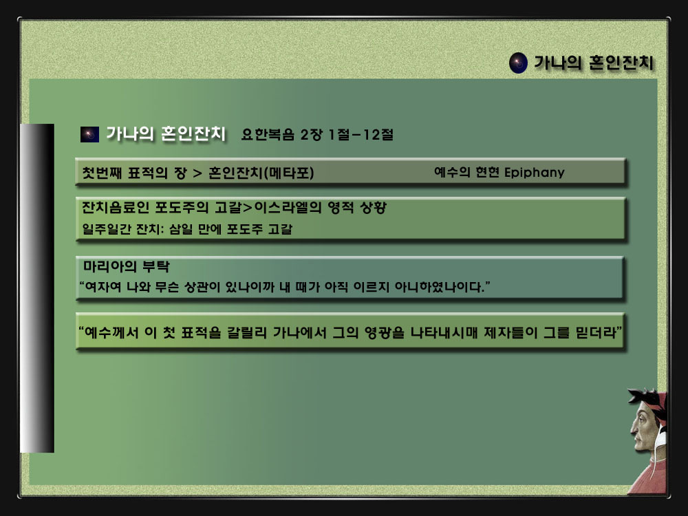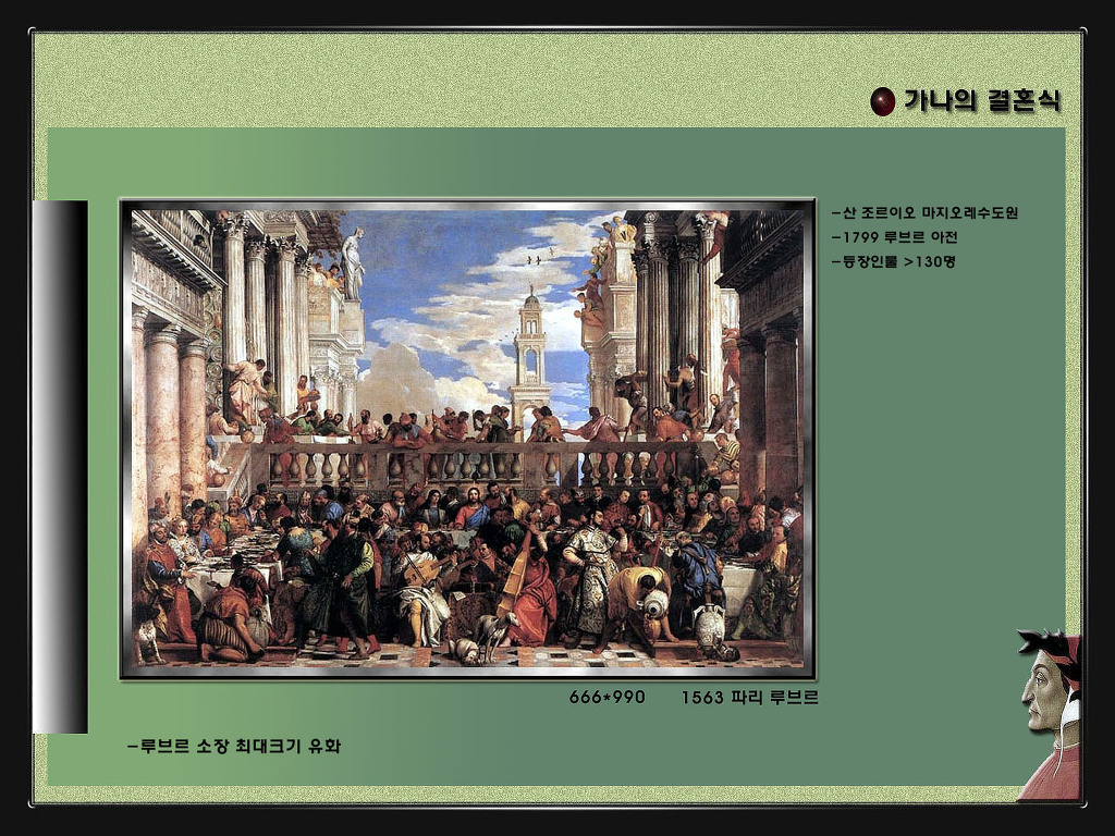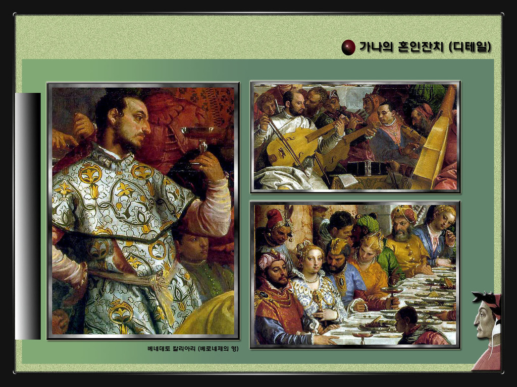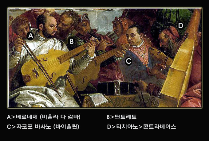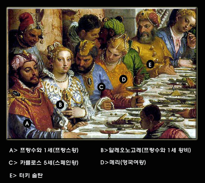 이 작품에는 130명의 인물이 등장하는데 하나같이 화려한 복장들이며 여기에서 당시 사치의 극치를 달리던 베네치아의 패션을 한눈에 볼 수 있다. 성모자의 바로 아래 자리에 4명의 악사들의 좌정해서 경쾌한 음악을 연주하고 있는데 이들은 당대 베네치아의 대표적 화가들이다. 당시 사람들에게 잘 알려진 인물들을 등장시킴으로서 예수님의 기적을 자기들의 삶 안으로 끌어들이려는 의도로 볼 수 있다.