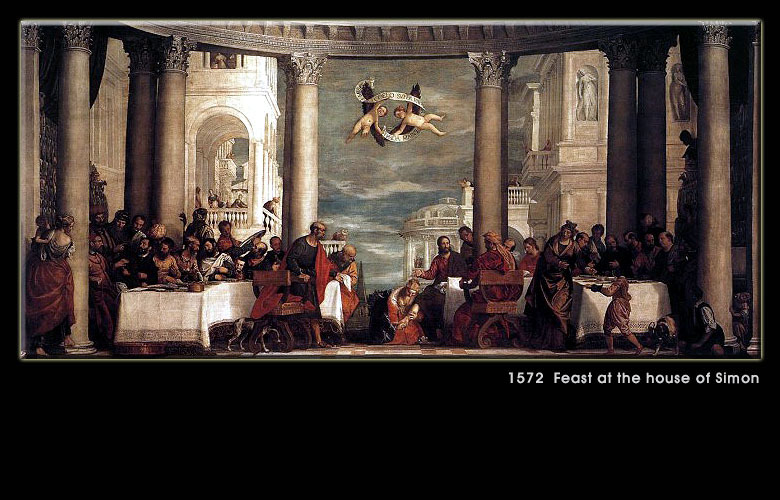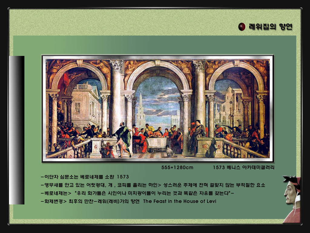 애초에는 베네치아의 한 수도원의 식당에 걸릴 <최후의 만찬>으로 청탁 받은 것이었다. 둥근 아치가 있는 큰 홀에서 성대한 향연이 치러지고 있는 이 그림은 웅장한 건축과 호화로운 비단옷을 입은 인물들 때문에 종교적 내면성이 결여된 작품으로 평가되어 베로네제는 종교재판관에게 불려가 조사까지 받았다. 결국 베로네제의 작품은 <최후의 만찬>으로 부를 수 없게 되었고, <레위 집의 향연>으로 제목을 바꾸도록 강요당했다.