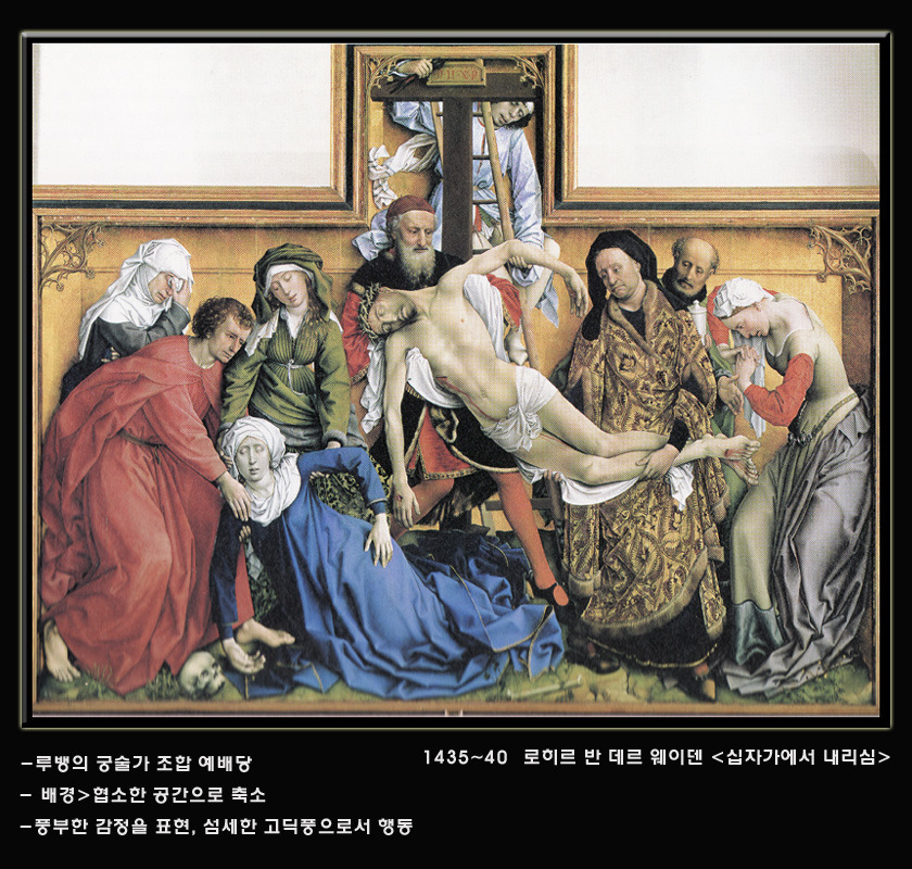중세 캐톨릭에서 성모 마리아는 인성보다는 신성이 강조되는 숭배의 대상이었다. 그러한 이유로 육신의 아들인 예수의 죽음 앞에서 실신하는 모습은 제단화로서 받아들여지기 어려웠지만 15세기 초, 북유럽 웨이던의 작품을 거쳐 16세기 후반에 이르자 베네치아에서도 이러한 금기는 깨지기 시작했다.