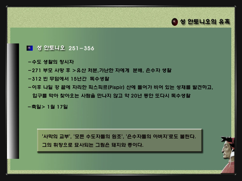 성 안토니오 은수자(251∼356)는 251년 이집트 북부의 고마에서 부유한 지주의 아들로 태어났다. 지주였던 부친이 많은 재산을 남기고 세상을 떠나자 물려받은 재산을 가난한 이들에게 나누어주고 사막으로 들어가 30년이 넘는 기간 동안 은거, 수도생활을 한다. 흔히 그를 최초의 수도자라 부르는데 그가 수도원을 설립했고, 엄격한 수도 생활의 모범을 보여줬기 때문이다. 성 안토니오 은수자와 관련해서는 그가 홀로 수도생활을 하던 중에 마귀가 끊임없이 그를 유혹했다는 일화가 전해지는데 성인은 높은 하늘까지 들려진 후 떨어지는가 하면, 돈의 유혹을 받기도 하고, 아름다운 여인의 유혹을 받기도 했다고 한다.