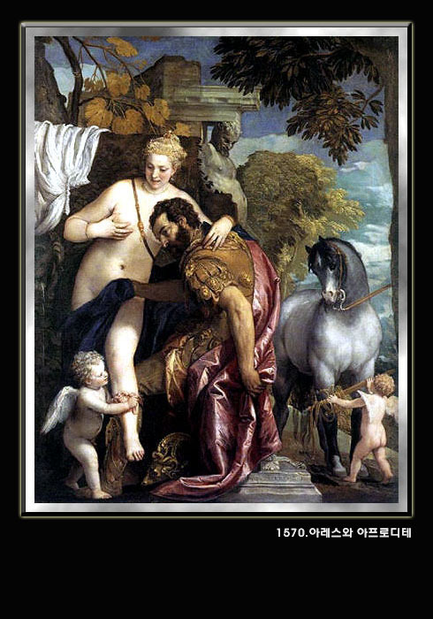 아프로디테와 아레스가 자신들의 두발을 끈으로 묶고 있는 에로스를 바라보는 모습은 이 사랑이 거부할 수 없는 숙명임을 암시하는 듯하다. 사실 에로스는 카오스, 가이아, 타르타로스와 함께 태초 신에 해당한다. 15세기에 프랑스에서 등장했던 퐁텐블로 화파의 영향으로 에로스가 아프로디테의 아들이란 설이 인기를 끌었고, 그리하여 ·아프로디테의 아들설· 비중이 더욱더 커지기 시작했다고 한다. 아름다움과 전쟁의 신, 둘 사이의 자식들인 Phobos(공포)-Deimos(근심)-Harmonia(조화)-Eros(사랑)...을 통해 그럴듯한 알레고리가 만들어 진다.