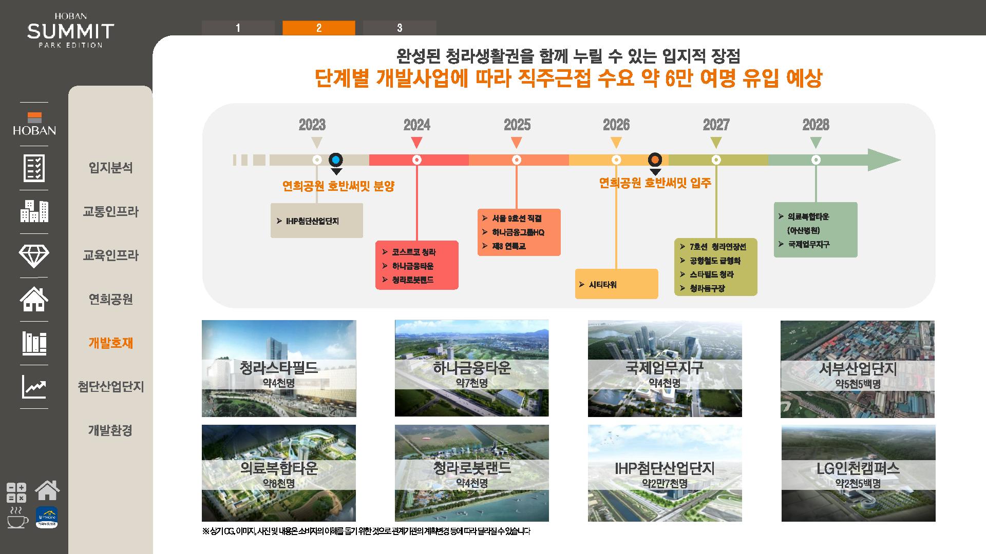 그 다음으로는 하나금융타운 조성으로 청라국제도시의 자체 역동력이 높아지는 금융거점이 마련되는 점입니다. 또한, 청라의료복합타운 2028년 조성 예정으로 대형 종합의료 복지환경의 편리함을 반경 10분대에서 누리게 될 것이며, 청라로봇랜드와 IHP첨단산업단지의 조성으로 기존의 제조산업 위주의 인천 서구의 일자리와 업무시설의 다양성은 더욱 확대되고 첨단화되는 모습으로 변화될 것이 명확해 보입니다.