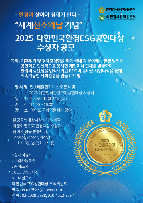 2025 대한민국환경ESG공헌대상 시상식 수상자를 신청받습니다.