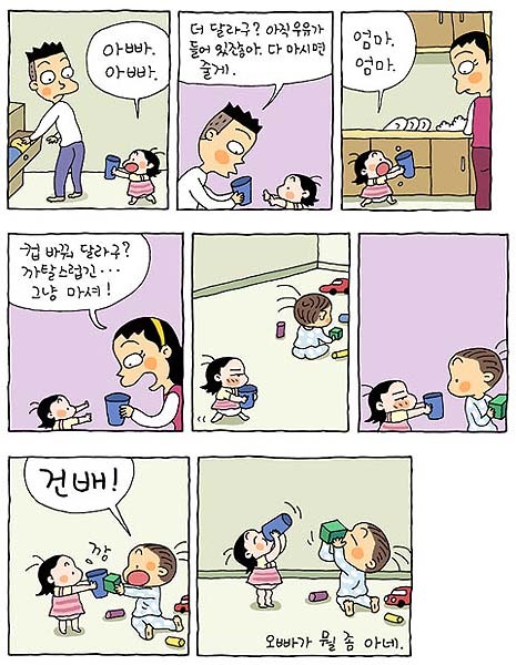 아빠는 컵을 들여다보고는 '우유가 들어있네, 다 마시면 더줄께'라고 대답한다.