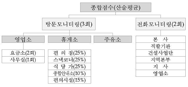 방문모니터링은 인사예절, 업무지식, 업무스킬 및 복장/환경상태에 대해 접점별 12~19개 문항으로 구성되며, 전화모니터링은 최초수신, 통화태도, 내용설명능력, 종료태도에 대한 17개 문항으로 구성된다.