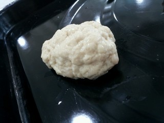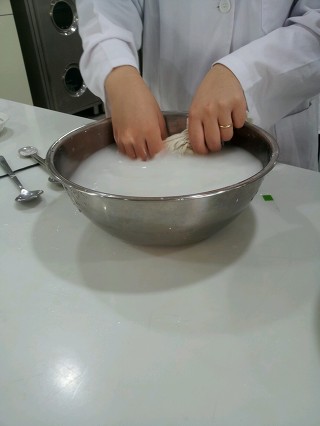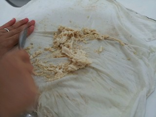 (3) (2)의 반죽을 거즈에 싸서 물이 든 큰 그릇 속에서 비빔으로써 전분을 씻어내고 습부율을 체크한다.