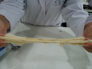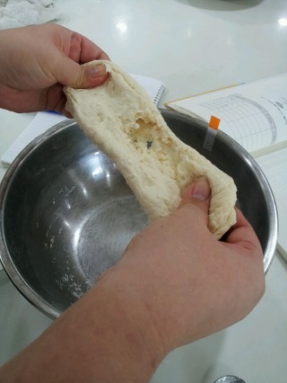 (2) (1)의 반죽을 200번 더 치대고 신장성을 본다.