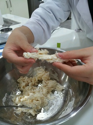 (1) A, B, C 시료의 밀가루 100g에 물 1/4컵을 넣고 수저로 재빨리 50번 젓고 두 손으로 그 신장성을 본다.