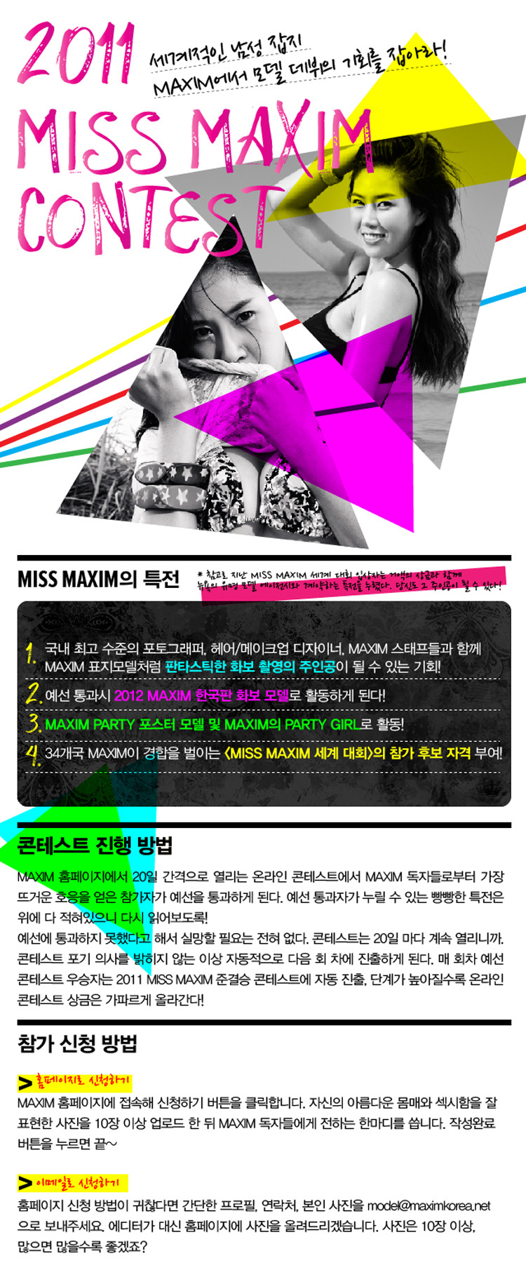 남성지 MAXIM에서 미스맥심 콘테스트가 열린다고 합니다. 미스맥심으로 선발되면 맥심에서의 화보촬영 기회는 물론, 전 세계 34개국 미스맥심 콘테스트에도 자동 출전 가능하다고 하니, 모델이 꿈인 분들에게는 좋은 기회가 될 것 같습니다!
