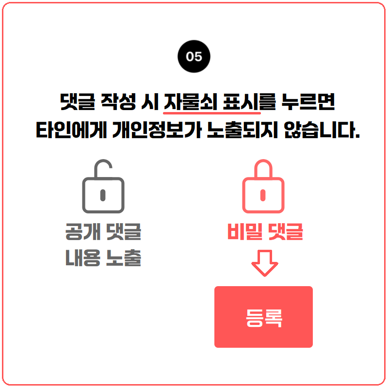 비밀 댓글은 댓글 작성 시 자물쇠 표시를 누르면 타인에게 개인정보가 노출되지 않습니다.
