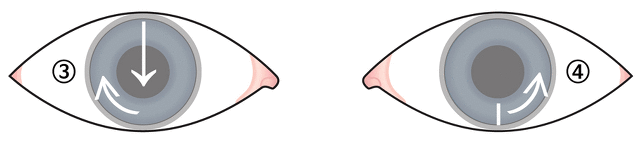 그림 2. 난시용 콘택트렌즈의 회전을 일으키는 요인. 1번, 2번: 눈을 감을 때 발생되는 위쪽 눈꺼풀과 아래쪽 눈꺼풀의 힘 방향(1번)으로 인하여 렌즈는 시계방향으로 회전하게 됩니다(지퍼 효과). 3번: 눈을 감는 속도가 눈을 뜨는 속도보다 빨라서 렌즈를 회전시키는 힘이 발생합니다. 4번: 눈을 뜨는 속도가 상대적으로 느리기 때문에 렌즈는 위쪽 눈꺼풀의 움직임을 쫓아 시계반대방향으로 회전합니다(속도 효과). 지퍼 효과(1, 2)와 속도 효과(3, 4)의 균형이 맞을 경우 난시 렌즈의 축 회전은 발생하지 않습니다. 이 균형이 깨지면 렌즈는 눈에서 회전하게 됩니다. 또한 이 요인 외에 착용자의 눈꺼풀 형태(눈 모양)도 난시 렌즈의 회전에 직접 관여합니다.