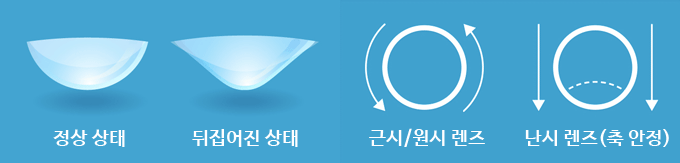 그림 1. 소프트 콘택트렌즈의 형태와 회전. 그림 왼쪽: 소프트 콘택트렌즈는 렌즈가 부드럽기 때문에 뒤집어 질 수 있습니다. 난시용 렌즈는 뒤집어진 상태를 근시용보다 확인하기 쉽습니다. 그 이유는 렌즈에 두꺼운 부분이 있기 때문입니다. 그림 오른쪽: 근시와 원시용은 렌즈가 눈에서 회전하더라도 교정력에 문제를 일으키지 않습니다. 반면 난시용 렌즈는 도수 효과가 달라져 문제가 생깁니다. 따라서 난시용 렌즈는 일정 방향을 유지시켜 도수 효과가 달라지지 않게 해야 합니다.