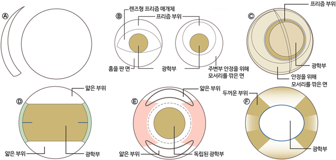 그림 3. 난시용 소프트 콘택트렌즈의 디자인 형태 분류. 난시용 렌즈는 렌즈 회전을 방지하기 위하여 특정 부분의 렌즈 두께를 증가시켜 무게추 또는 걸림돌을 만듭니다. 대부분 무게 중심을 아래에 위치시켜 무게추 효과를 이용하지만 양쪽으로 분산시키는 디자인(E, 오아시스 난시용) 또는 두꺼운 부분을 분산하여 무게추와 걸림돌 역할을 하도록 만든 디자인(F, 모이스트 난시용)도 있습니다. 참고로 E 디자인의 극단적 형태는 메니콘의 미루 원먼스 난시용입니다.