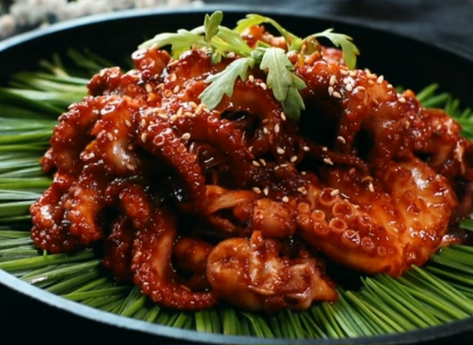 6. 팬에 식용유, 고추기름 넣고 대파, 양파 넣고 볶다가 쭈꾸미 양념장을 넣은후 2분간 센 물록
