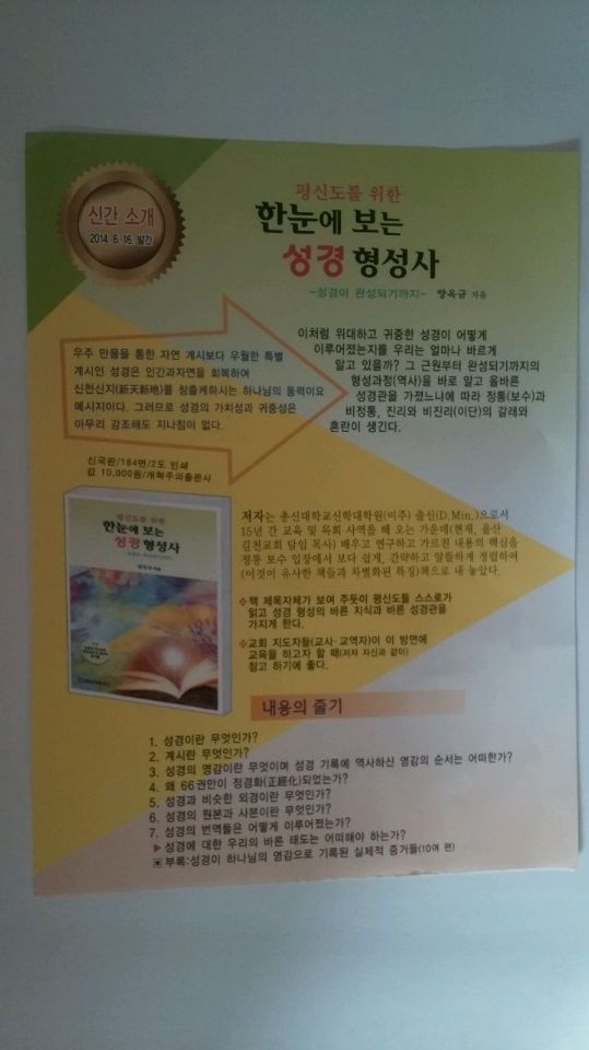 양 옥규 목사님이 평신도들과 성경을 가르치고 QT를 지도하는 성경교사들을 위하여, 알기쉬운 성경형성사(聖經形成史)를 저술하였습니다. 여러 책들을 참고하고 그 내용을 간추려서 한눈에 볼 수 있도록 잘 구성하여 놓았습니다.