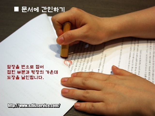 작성된 서류 중 정관과 같이 문서가 2장 이상인 경우, 문서 맨 마지막에 날인하는 모든 도장을 가지고 간인(앞장을 접어서 뒷장과 겹쳐지게 한 후 접힌 부분에 찍는 것)을 하셔야 합니다.