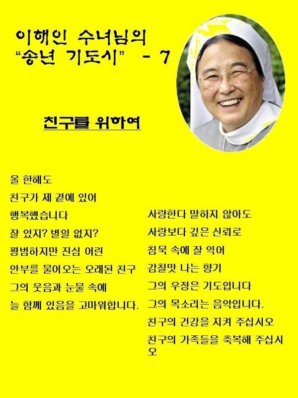 이해인 수녀님의, 송년 기도시 작성자멋쟁이(사도요한)|작성시간20.12.23|조회수260 목록 댓글 0 글자크기 작게가 글자크기 크게가 다음검색 현재 게시글 추가 기능 열기 북마크 신고 센터로 신고 댓글 댓글 0 댓글쓰기 답글쓰기 댓글 리스트